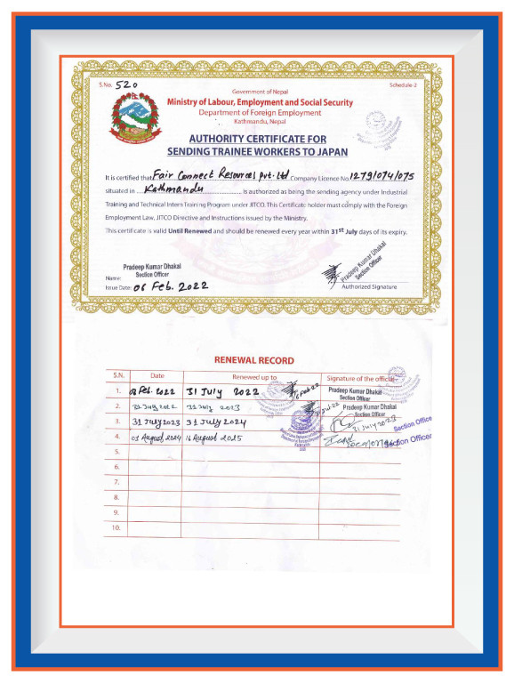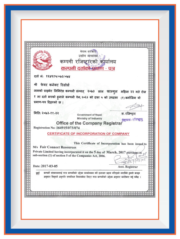 Fair Connect Resources P. Ltd. is fully accredited and recognized by several key governmental bodies, underscoring our commitment to legality, professionalism, and high-quality standards in manpower recruitment and foreign employment services. Our registration with the Ministry of Industry & Commerce, Office of the Company Registrar, under the Company Registration No.: 164915/073/074, establishes our legal foundation and operational legitimacy. Further solidifying our authority to operate in the foreign employment sector, the Ministry of Labour, Employment & Social Security, Department of Foreign Employment, has granted us a Government License No: 1279/074/075. Complementing our legal compliance, the Ministry of Finance, Department of Internal Revenue, recognizes us with a PAN No.: 605986578, ensuring our adherence to tax regulations and fiscal responsibilities. Beyond national accreditation, we are proud to hold the ISO 9001:2015 certification, a testament to our unwavering commitment to quality management systems in manpower recruitment and foreign employment services. Additionally, our membership in the Nepal Association of Foreign Employment Agencies signifies our active participation in the community of professionals dedicated to ethical practices and excellence in the field of foreign employment. These credentials not only highlight our dedication to operational excellence but also our pledge to maintain the highest standards of service and integrity in connecting global talent with opportunities.
