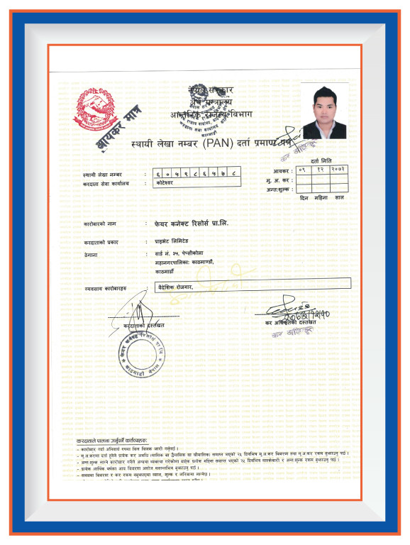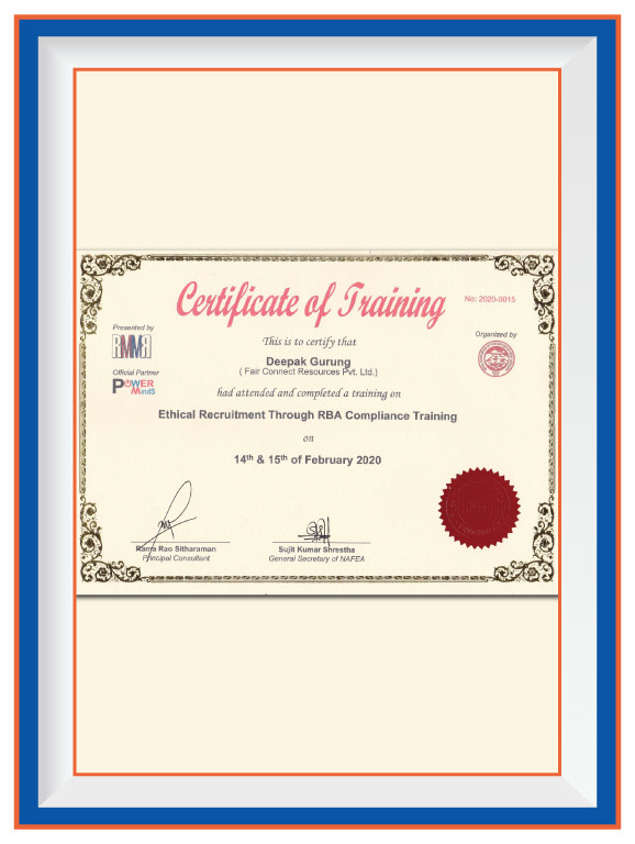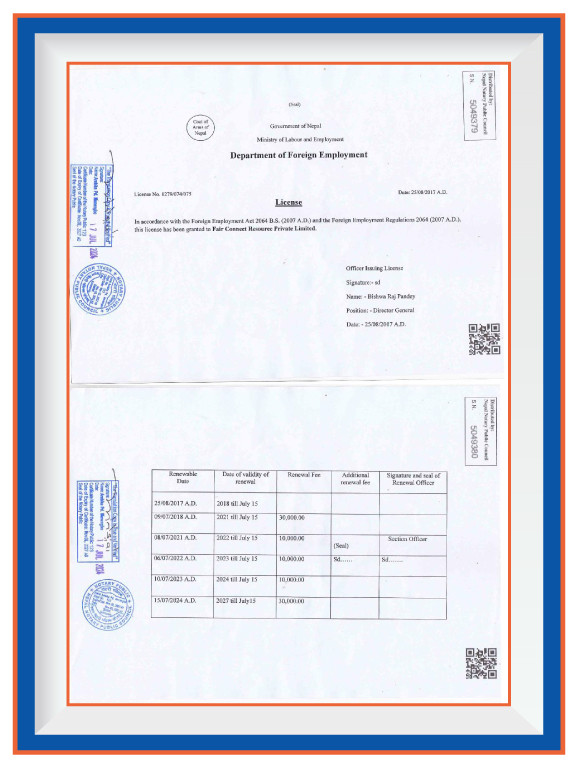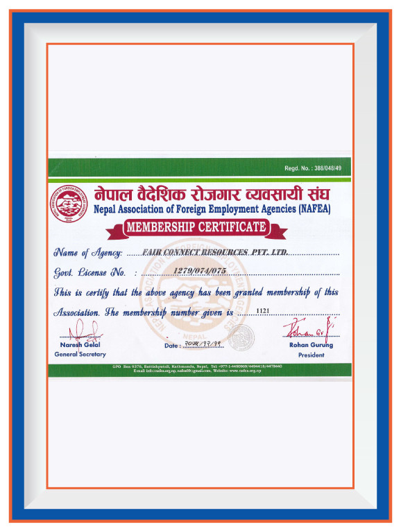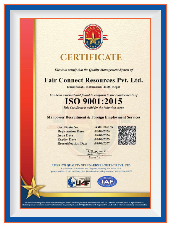 Fair Connect Resources P. Ltd. is fully accredited and recognized by several key governmental bodies, underscoring our commitment to legality, professionalism, and high-quality standards in manpower recruitment and foreign employment services. Our registration with the Ministry of Industry & Commerce, Office of the Company Registrar, under the Company Registration No.: 164915/073/074, establishes our legal foundation and operational legitimacy. Further solidifying our authority to operate in the foreign employment sector, the Ministry of Labour, Employment & Social Security, Department of Foreign Employment, has granted us a Government License No: 1279/074/075. Complementing our legal compliance, the Ministry of Finance, Department of Internal Revenue, recognizes us with a PAN No.: 605986578, ensuring our adherence to tax regulations and fiscal responsibilities. Beyond national accreditation, we are proud to hold the ISO 9001:2015 certification, a testament to our unwavering commitment to quality management systems in manpower recruitment and foreign employment services. Additionally, our membership in the Nepal Association of Foreign Employment Agencies signifies our active participation in the community of professionals dedicated to ethical practices and excellence in the field of foreign employment. These credentials not only highlight our dedication to operational excellence but also our pledge to maintain the highest standards of service and integrity in connecting global talent with opportunities.